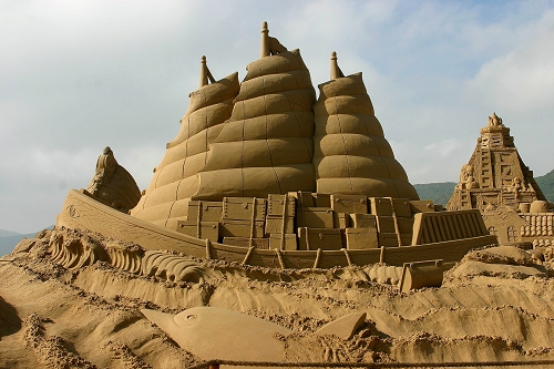 当天下午,“辉煌60年 全国网媒记者浙江行”采访团来到位于舟山朱家尖海滩公园,参观了该海滩公园。当记者们来到公园门前时,就被一副巨大的雕塑作品吸引了,走进一看才发现,原来这尊雕塑全部都是用沙子雕砌而成的。走进公园后发现,公园内通往海滨公园的道路两旁,都是用海砂雕塑的作品:有小孩子喜欢的白雪公主和小矮人,有神秘莫测的埃及金字塔,还有英姿飒爽的运动健儿......总之,只要想得到的,这里都应有尽有,这便是被喻为将沙子变成金的沙雕艺术。