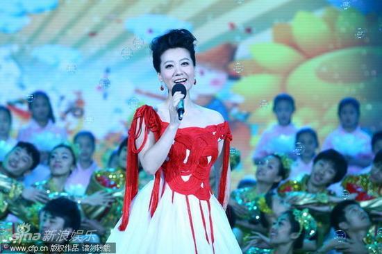 歌手谭晶则身穿红色的中国结上衣搭配白裙登台献唱,身后则有一群舞者伴舞,和往年的歌唱节目颇为类似。图为谭晶深情演唱。